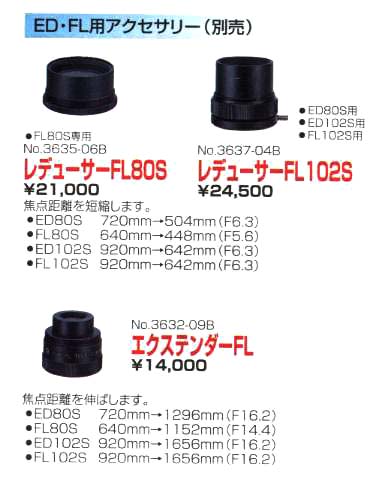 | 対物鏡有効径 | 80mm(EDレンズ、アポクロマート) | 102mm(EDレンズ、アポクロマート) | 102mm(EDレンズ、アポクロマート) | 120mm(4枚玉ネオアクロマート) | 対物鏡有効径 |